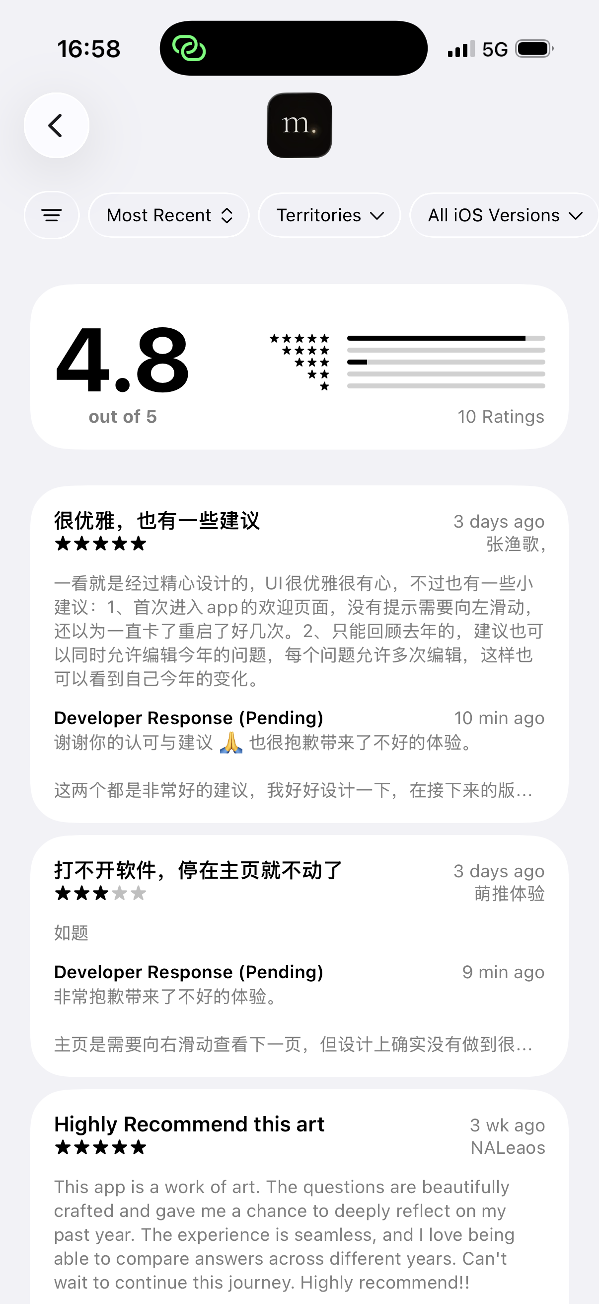 Melior 收到了好几份评论,很开心!之前还收到了几封邮件,有了很宝贵的建议。下午改了代码发了版,但是晚上紧急撤回了,有一些小细节没有考虑到。