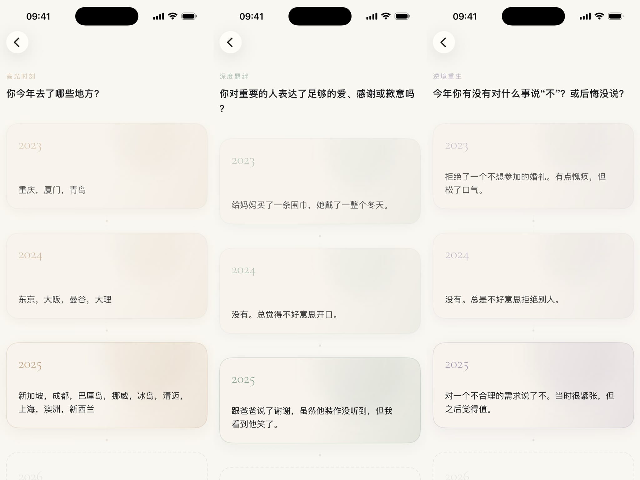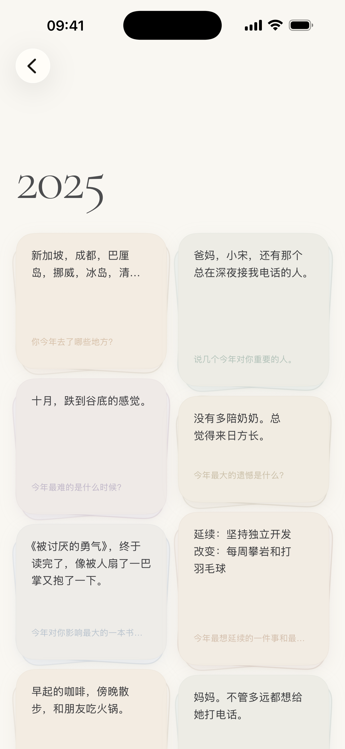 后来我读到 Obsidian 的创始人每年会问自己 40 个问题,同一套问题,年年问,年年答案不一样。我当时就觉得这是我需要的,我想要把这个想法做成一个 App。