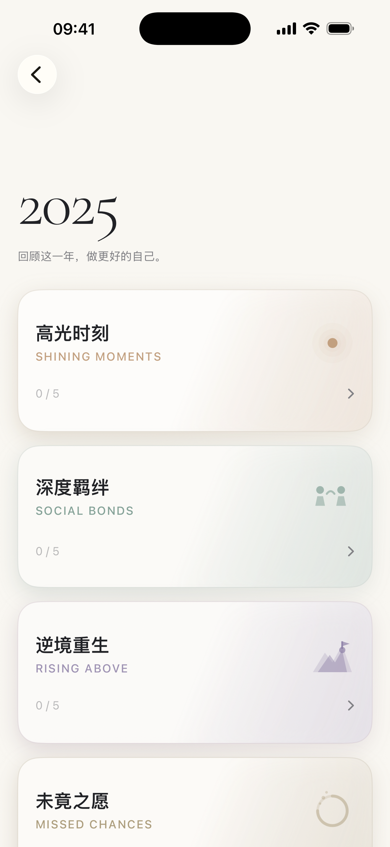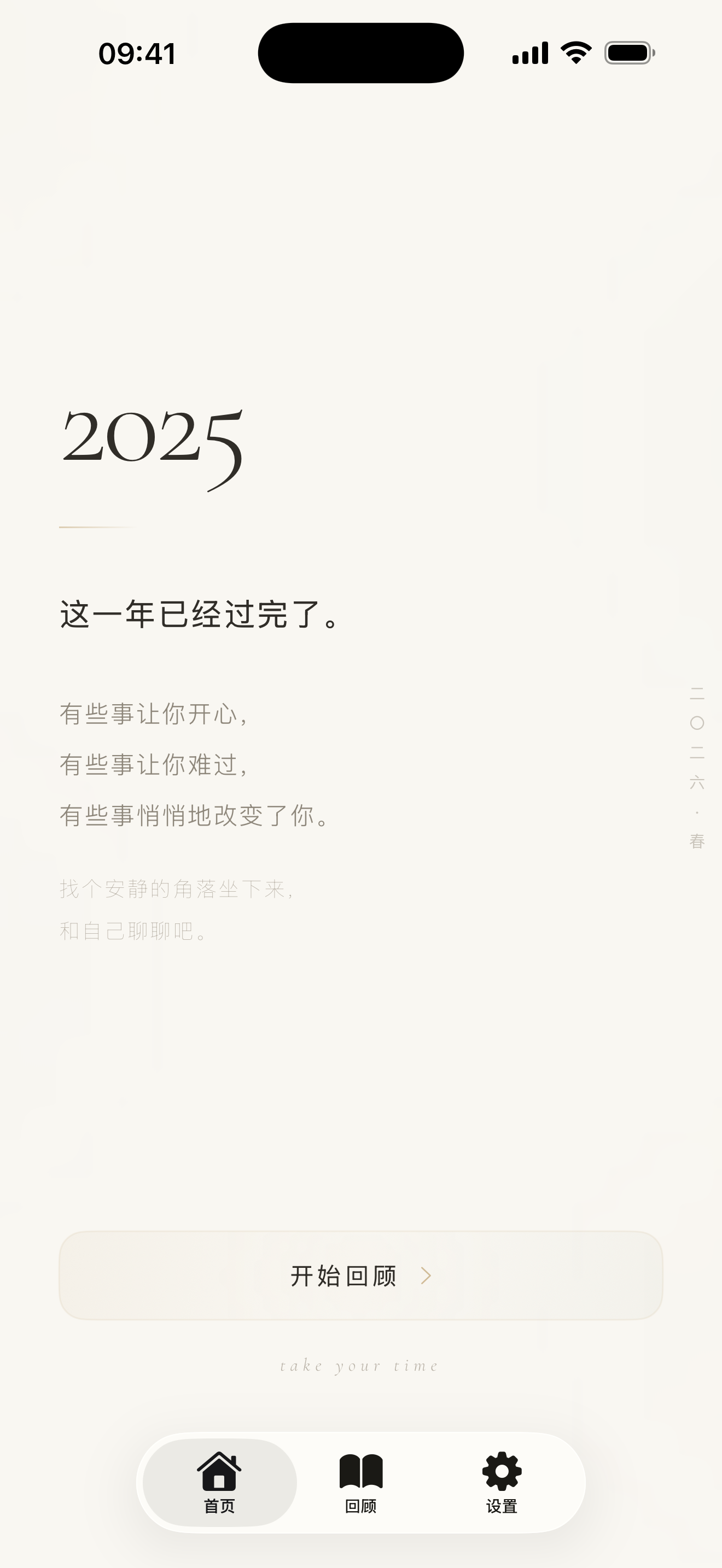 这是核心功能之一:30 个问题,6 个章节,回答完就会看到一本关于你这一年的书。